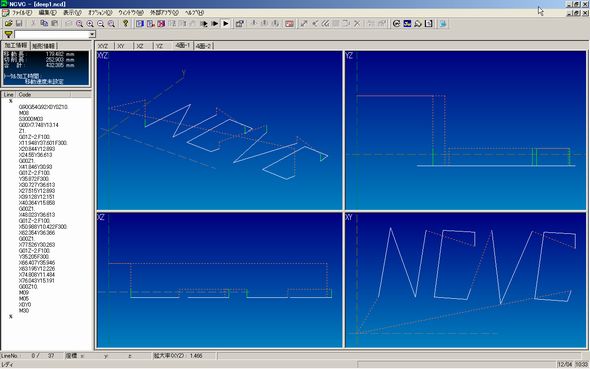 | この画像は、MeshCAMと言う、低価格の3DCAMソフトの体験版で出力したNCデータを NCVCで描画して見た画像です |