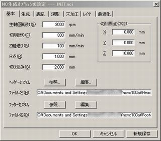 出力ファイル名や条件ファイル名を設定します。切削条件ファイルはここからでも編集が可能です